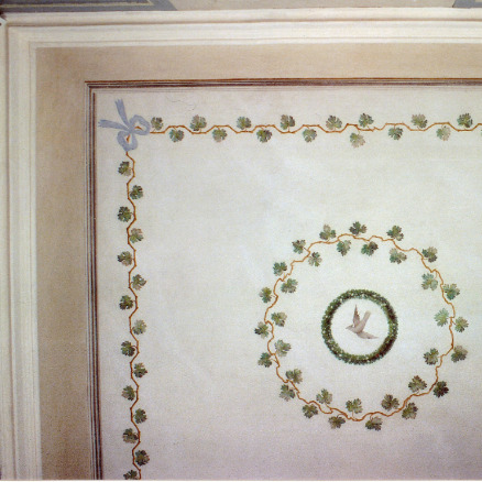 Reinigung, Abnahme der jüngeren Übermalungen, Kittung von Rissen, farbliche Integration von Fehlstellen an der klassizistischen Deckenmalerei (um 1800), Dokumentation. Arbeit als Subunternehmerin der ARGE Dipl.- Restauratorinnen S. Bodechtel, M. Schoder und S. Cisielsky.