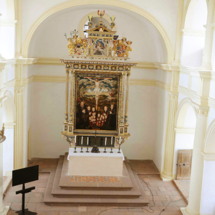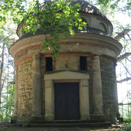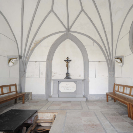 Restauratorische Untersuchung der bauzeitlichen Farbigkeit des Innenraumes der Grabkapelle und der Gruft, des Kruzifixes auf dem Altar sowie der fünf Namenstafeln der in der Gruft befindlichen Särge, Kostenschätzung zur Restaurierung des Kruzifixes und der fünf Namenstafeln, Dokumentation