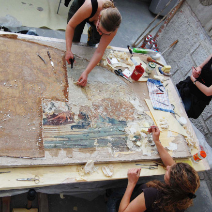Provinienzforschung, Schadenskartierung, Materialanalysen, Probenreihen zur Reinigung, Putzhinterfüllung sowie Kittung von Fehlstellen, Entfernung unästhetischer Retuschen und Altkittungen, Entfernung des Caparol-Überzugs, Malschichtfestigung, Putzhinterfüllung, Kittung der Fehlstellen, farbliche Integration der Kittungen und stark störender Fehlstellen, schriftliche und fotografische Dokumentation. Ausführung in Zusammenarbeit mit Katharina Montag M.A. Restauratorin