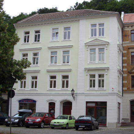 Restauratorische Untersuchung der Fassadenfarbigkeit, Materialanalysen, Erstellung eines Ergänzungsgutachtens zu der bereits bestehenden Dokumentation, Farbentwurf. Ausführung in Zusammenarbeit mit Restauratorin Carola Magnus.