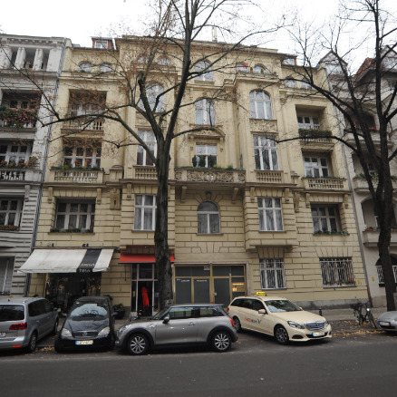 Befunduntersuchung und partielle Freilegung der historischen Wand-, Decken und Fahrstuhlfassungen in den Hauseingängen, schriftliche und fotografische Dokumentation. Ausführung im Rahmen eines einjährigen studienvorbereitenden Praktikums bei der Senatsverwaltung für Stadtentwicklung und Umweltschutz Berlin, Abt. Baudenkmalpflege
