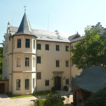 Bestands- und Zustandserfassung, Schadursachenanalyse für die Außenfassade, die Eingangshalle, das Treppenhaus sowie die Räume 1 und 3 im ersten Obergeschoss, Materialanalysen, Konzeptentwicklung und Projektsteuerung und -betreuung, Dokumentation. Arbeit im Rahmen der Betreuung des Fachbereiches Wandmalerei / Architekturfarbigkeit am Studiengang Kunsttechnologie, Konservierung und Restaurierung von Kunst- und Kulturgut an der HfBK Dresden