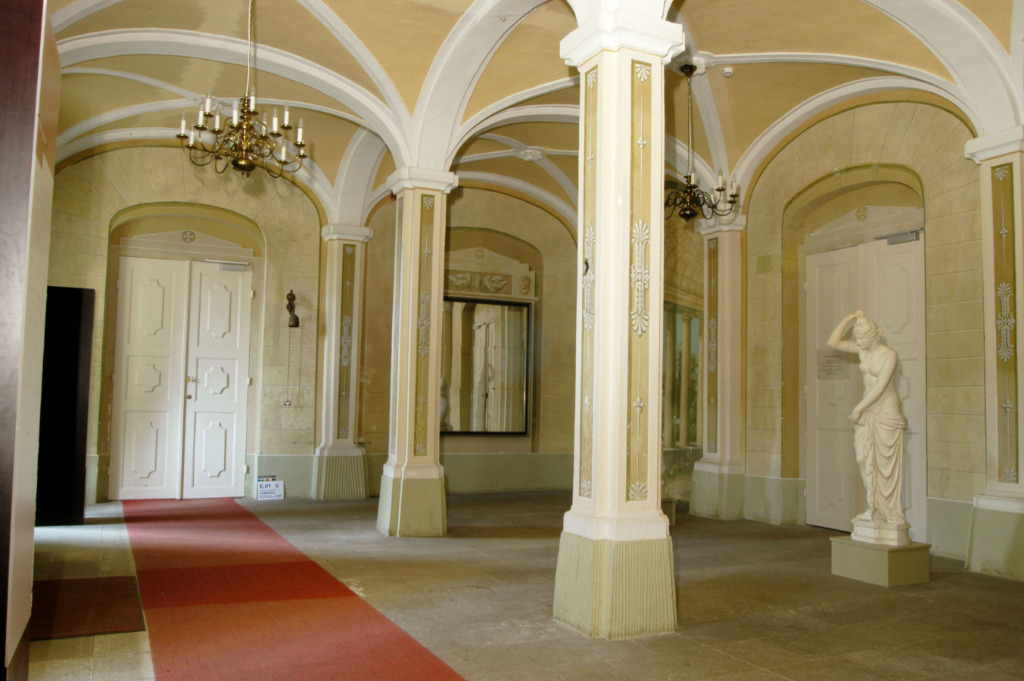 Die Eingangshalle des Schlosses, welche man durch den Hauptzugang des Schlosses von Norden her betritt, ist ein sechsjochiger Raum mit einem Kreuzgratgewölbe über zwei kreuzförmigen raumteilenden Pfeilern sowie Pilastern. Ein sich westlich der Eingangshalle anschließender Treppenhausgang, führt in das zweiarmige großzügige Treppenhaus mit einem Treppenumgang im Obergeschoss. Sowohl die Eingangshalle als auch das Treppenhaus weisen eine Architekturmalerei auf, welche größtenteils aus den 1960er Jahren stammt. Bei dieser Fassung handelt es sich jedoch um die Restaurierung bzw. Rekonstruktion einer älteren Malerei, welche wahrscheinlich in die Zeit zwischen 1794-1817 datiert werden kann, als Friedrich von Kleist Besitzer des Schlosses war. Wie auch in der heutigen Sichtfassung werden bei dieser klassizistischen Malerei die Wandflächen durch aufgemalte Architekturgliederungen in Trompe-l´oeil-Manier illusionistisch geöffnet.